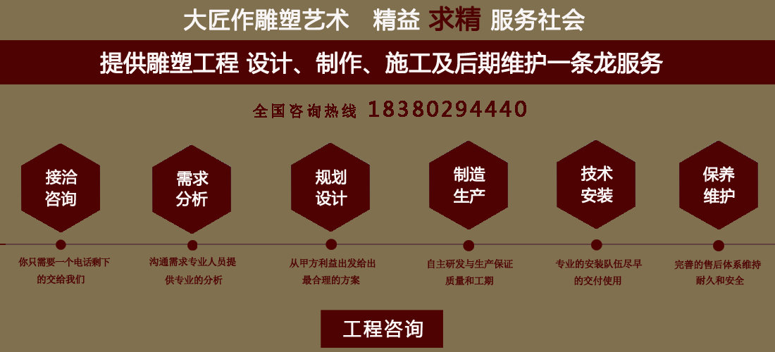 成都大匠作雕塑有限公司,是經成都工商局審定注冊的正規專業雕塑制作及工程安裝服務機構,是由一群年輕富有朝氣的年輕人創辦,發軔于四川省成都市龍泉驛區。它是一家******于創作、制作和銷售為一體的公司。大匠作擁有多年從事公共藝術的專業人員和雕塑制作人組成的核心團隊,為您提供專業、具創新的設計及制作服務。公司成立以來,秉承“******服務、誠信為本”的宗旨,以客戶需求為目標導向,不斷學習,進取,優化和提高服務質量,公司向您******——“您的滿意***是我們的信譽”,我們將以飽滿的熱情和******的服務贏得您的贊譽和支持。 愛心,細心,耐心,責任心是我們的要求,盡心盡職,為您打造出創新、專業、******的設計方案,我們堅信先做人、后做事,用心對待客戶,實行透明收費,人性化服務,本著對客戶負責,對客戶負責,更是對自己發展負責的態度,爭取做到讓每位客戶滿意